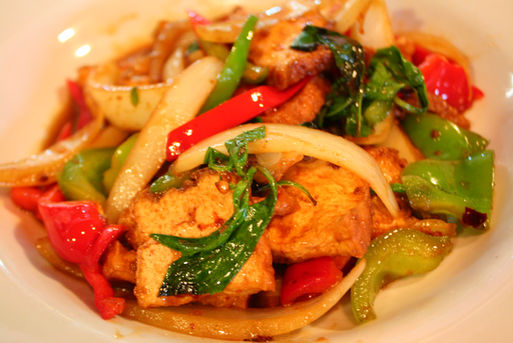 Tofu, peppers, Thai basil and onions in a sweet and spicy sauce.